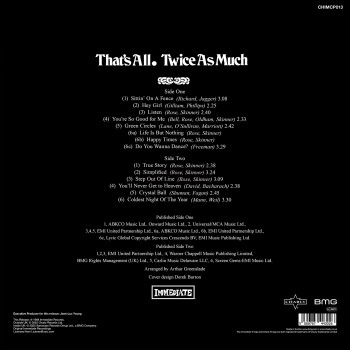DATE DE SORTIE : 21 NOVEMBRE 2025 LES COMMANDES COMPRENANT DES ARTICLES EN PRÉCOMMANDE NE SERONT PAS EXPÉDIÉES AVANT QUE LES ARTICLES EN PRÉCOMMANDE SOIENT DISPONIBLES - POUR ÉVITER LES RETARDS D'EXPÉDITION, VEUILLEZ COMMANDER LES ARTICLES EN PRÉCOMMANDE SÉPARÉMENT DES ARTICLES EN STOCK. “That’s All”, premier album du duo britannique Twice As Much (Dave Skinner et Andrew Rose), brille par ses harmonies luxuriantes et sa production « wall of sound ». Signé sur Immediate Records par Andrew Loog Oldham, il s’ouvre sur leur reprise des Rolling Stones “Sitting On A Fence”. Sorti en 1966, cet album baroque et ensoleillé incarne l’esprit pop de l’époque. Réédité pour les 60 ans d’Immediate, il réunit notamment Jimmy Page et John McLaughlin.