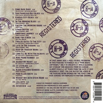 These previously unreleased 1965 recordings, recently unearthed by Jorma’s wife Vanessa in a long-forgotten family attic box, offer a unique glimpse into the early days of Jorma Kaukonen—just before Jefferson Airplane. Restored from the original master tapes, these tracks capture the folk spirit of a young man searching for his voice. To celebrate his 85th birthday, Jorma finally shares them: an intimate, raw, and precious journey into the heart of a formative era. PURPLE CD VINYL REPLICA LIMITED TO 2,000 UNITS WORLDWIDE.