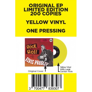 The Spanish 45 rpm El Rock and Roll (3-20163) is one of the most charming records from the early years of Elvis Presley’s career. Its colorful sleeve, typical of Spanish local editions, highlights a vibrant retro aesthetic that appeals to collectors. Featuring four essential tracks, this pressing is now highly sought after for its scarcity. YELLOW vinyl edition, strictly limited to 200 copies.
