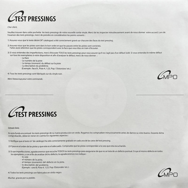 Un Test Pressing est une épreuve de contrôle d’un vinyle, pressée en maximum 5 exemplaires. Il sert à vérifier la qualité audio, détecter d’éventuels défauts et valider la matrice avant la production finale. C’est une étape essentielle garantissant un pressage fidèle, propre et conforme aux attentes. Celui présenté ici fait partie de ces cinq uniques copies : un véritable collector, rare et recherché par les collectionneurs exigeants.
