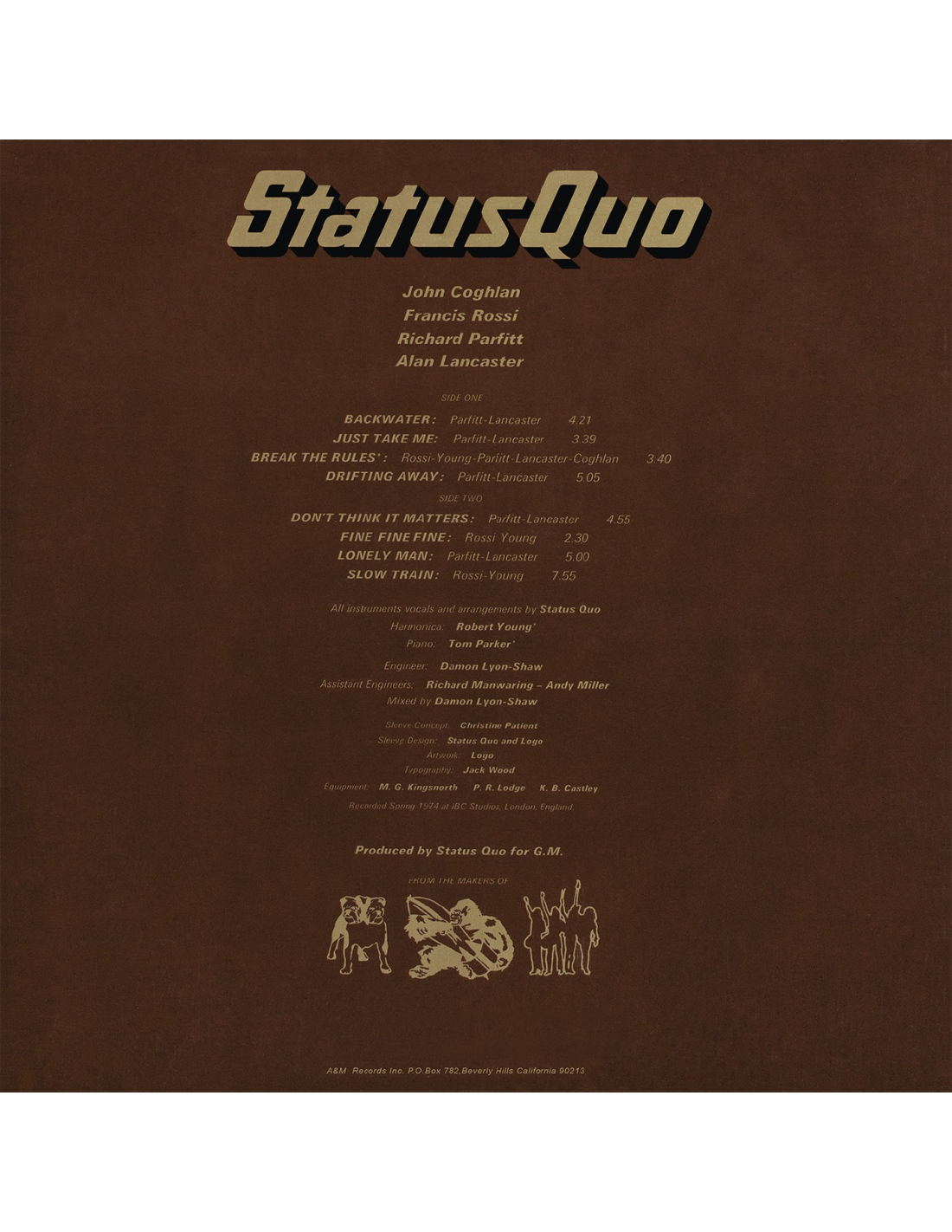Quo est le septième album studio du groupe Status Quo. Enregistré comme ses prédécesseurs à Londres aux Studios IBC. Avec les membres Francis Rossi, Richard Parfitt, Alan Lancaster and John Coghlan, cet album a été composé par le groupe à lexception du titre Bonus "Lonely Night".