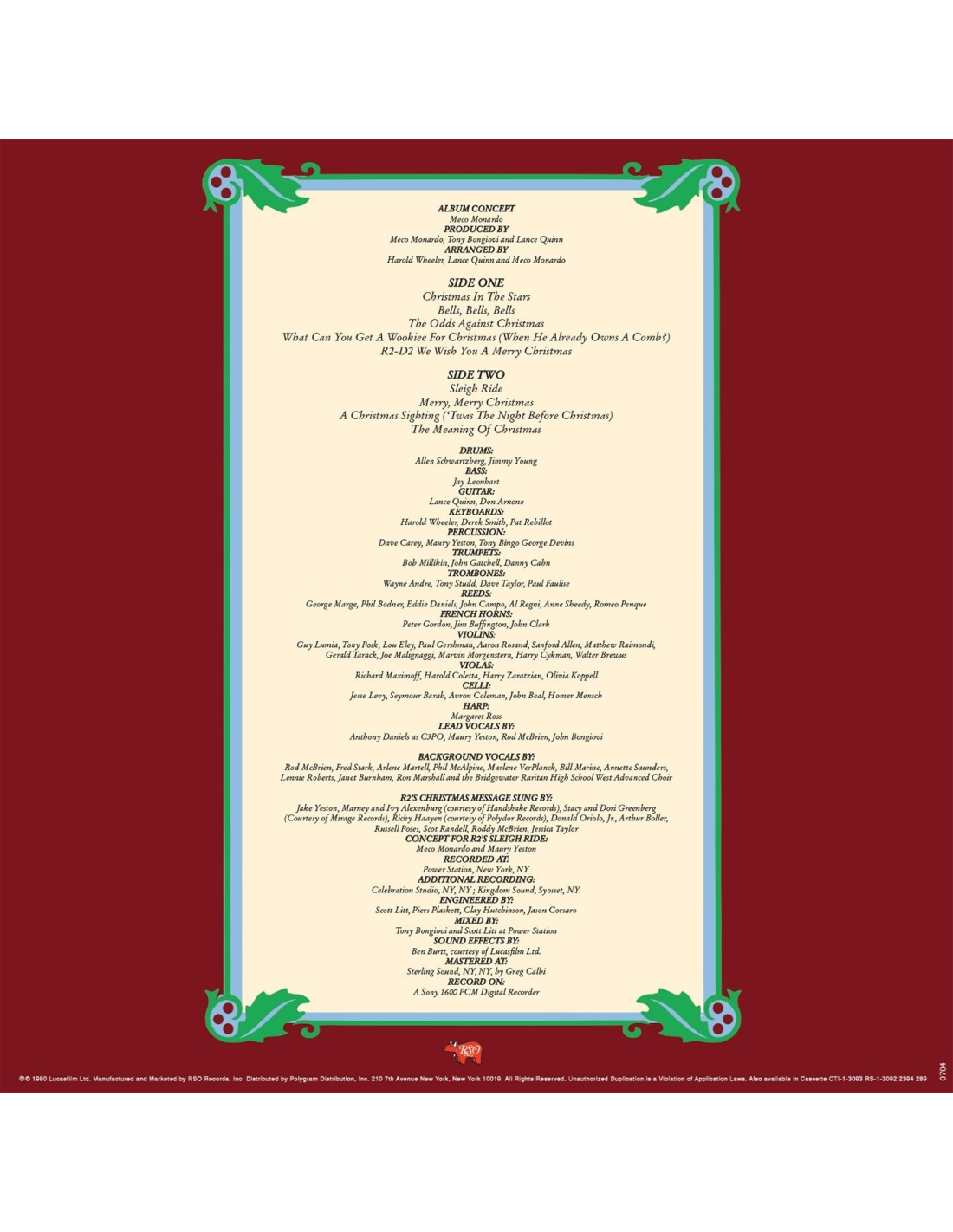 STAR WARS - LE REVEIL DE LA FORCE EST DANS LES SALLES LE 18 DÉCEMBRE 2015 ! Il y a 35 ans... sortait cet album de Noël. Avec la voix d'Anthony Daniels (la voix officielle de C-3PO) et les sons de Ben Bur (R2-D2 & Chewbacca)... cet album marqua les esprits pour 2 raisons : Son succès... puisque le single ''What Can You Get a Wookiee for Christmas (When He Already Owns a Comb)'' grimpa dans le Top 100 américain, mais aussi parce que fut le premier enregistrement d'un certrain... Jon Bon Jovi (crédité John Bongiovi) ! Pour cette sortie ''Noël'', nous avons réalisé un CD rouge, mais donnant toujours l'impression de retrouver le vinyle !