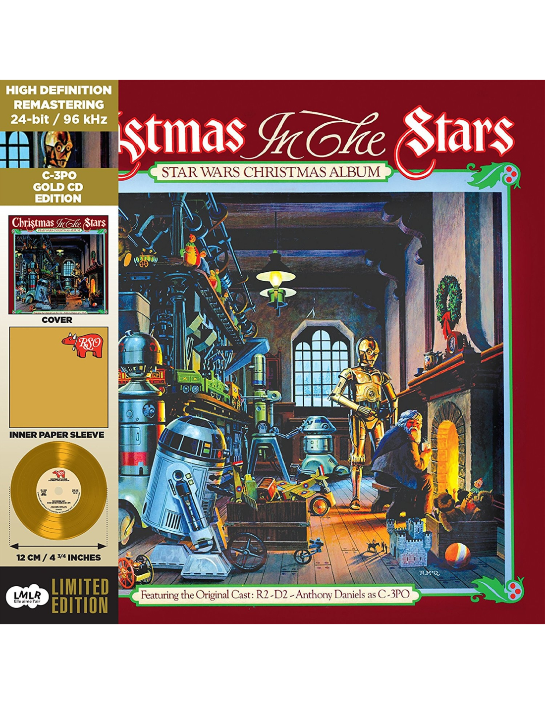 STAR WARS - LES DERNIERS JEDI EST DANS LES SALLES LE 13 DÉCEMBRE 2018 ! Il y a 38 ans... sortait cet album de Noël. Avec la voix d'Anthony Daniels (la voix officielle de C-3PO) et les sons de Ben Bur (R2-D2 & Chewbacca)... cet album marqua les esprits pour 2 raisons : Son succès... puisque le single ''What Can You Get a Wookiee for Christmas (When He Already Owns a Comb)'' grimpa dans le Top 100 américain, mais aussi parce que ce fut le premier enregistrement d'un certrain... Jon Bon Jovi (crédité John Bongiovi) ! Pour cette sortie ''Noël'', nous avons réalisé ce CD en 3 versions... Une version avec un CD rouge. Une version C-3PO... avec un CD Doré et une version R2-D2... avec un CD Platine. Dans cette édition... vous aurez le CD Doré... alors, ne soyez pas les derniers à le posséder !