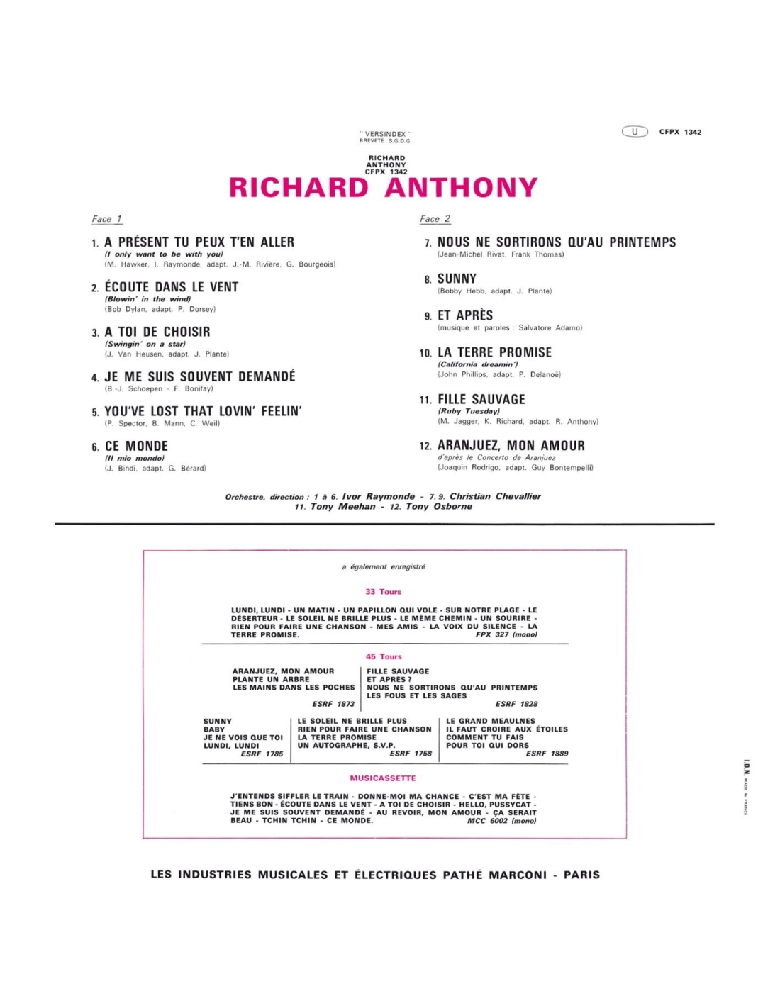 1. A Présent Tu Peux T'en Aller ; 2. Écoute Dans Le Vent ; 3. A Toi De Choisir ; 4. Je Me Suis Souvent Demandé ; 5. You've Lost That Lovin' Feelin' ; 6. Ce Monde ; 7. Nous Ne Sortirons Qu'au Printemps ; 8. Sunny ; 9. Et Après ; 10. La Terre Promise ; 11. Fille Sauvage ; 12. Aranjuez Mon Amour ; 13. Plante Un Arbre (Titre Bonus) ; 14. Les Mains Dans Les Poches (Titre Bonus) ; 15. Le Grand Meaulnes (Titre Bonus) ; 16. Comment Tu Fais ? (Titre Bonus) ; 17. Pour Toi Qui Dors (Titre Bonus) ; 18. Les Fous Et Les Sages (Titre Bonus) ; 19. E In Primavera Te Ne Andrai (Nous Ne Sortirons Qu'au Printemps) (Titre Bonus) ; 20. Rubacuori (Fille Sauvage / Ruby Tuesday) (Titre Bonus) - Richard Anthony