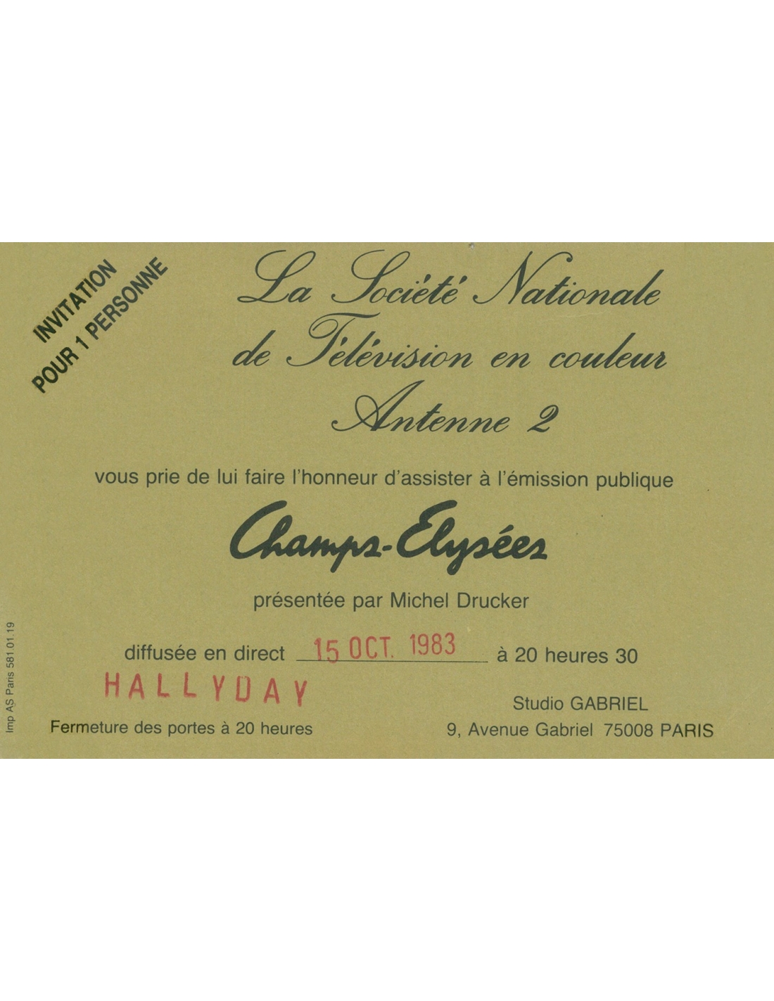 - L’invitation À L’émission Champs Elysées Le 15 Octobre 1983.