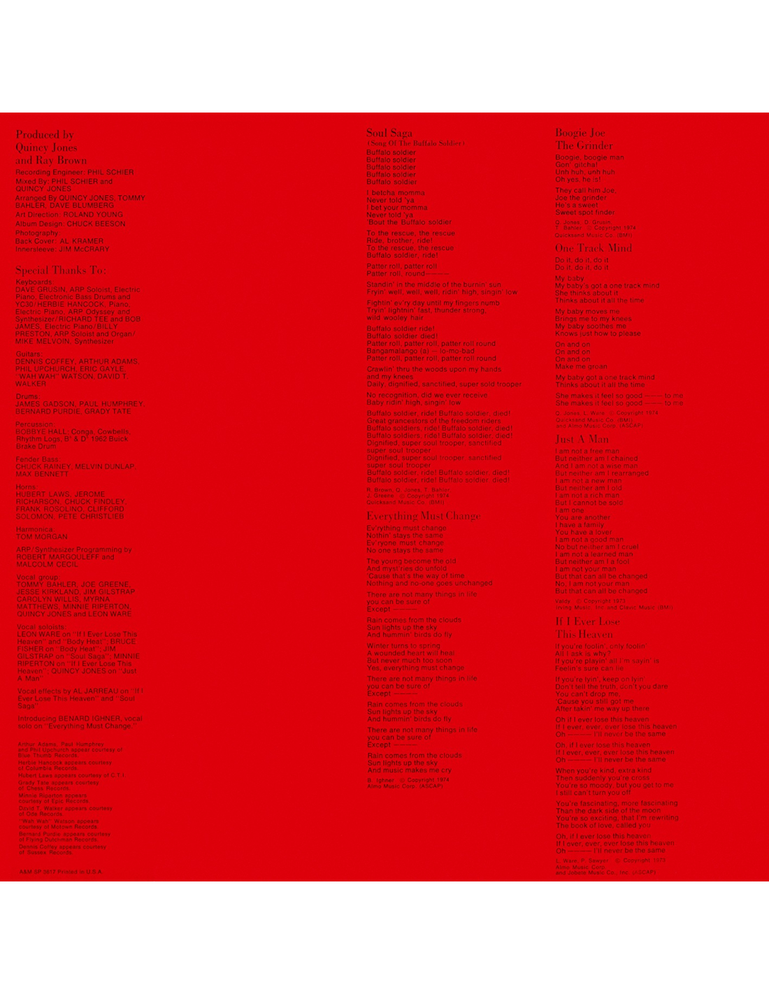 On ne s’éloigne vraiment jamais du Jazz… même si cet album est résolument SOUL… Quincy Jones s’est entouré d’une pléiade de stars du Jazz (Herbie Hancock, Frank Rosolino, Hubert Laws, Jerome Richardson, Grady Tate, Bob James)… laissant quand même de la place à quelques grands noms de la Soul, comme Leon Ware, Minnie Riperton, Al Jarreau, Billy Preston, Bernard Purdie & Wah Wah Watson…