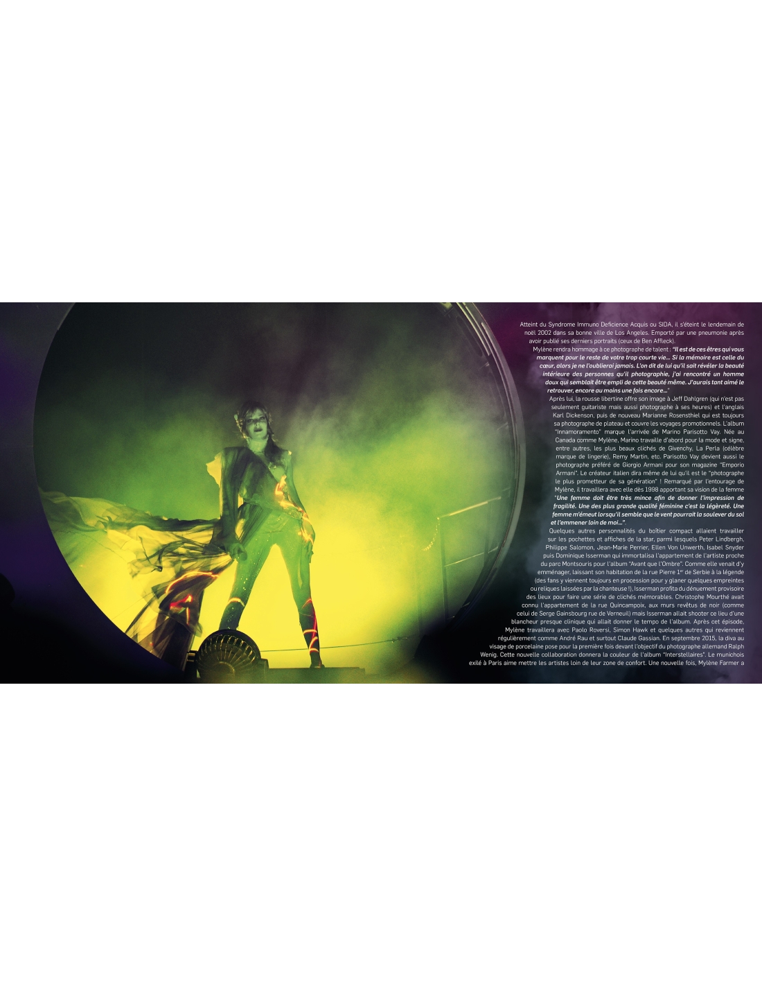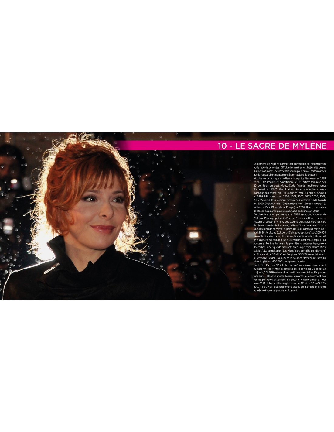 Cet ouvrage retrace la carrière de la rousse libertine. De son premier 45 tours “Maman a tort” jusqu’à son dernier album “Live 2019”. D’un petit studio d’Aubervilliers jusqu’au Paris La Défense Arena, plus de trente-cinq années d’une carrière auréolée d’énigmes, de légendes et autres sulfureuses rumeurs. Qui est cette femme au mystère savamment entretenu, submergeant, tel un raz de marée, les billetteries de l’Hexagone à l’annonce de chacun de ses concerts ? Qui se cache réellement derrière le masque de cette “alchimiste” des hit-parades ? Une exubérante libertine ou une sage poétesse de la chanson ? Tantôt romantique ou sexy, macabre ou provocante, ce livre - incluant la discographie complète de l’artiste et de nombreux témoignages - raconte pour la première fois trente-six années de la vie de Mylène Farmer, la diva au visage de porcelaine.
