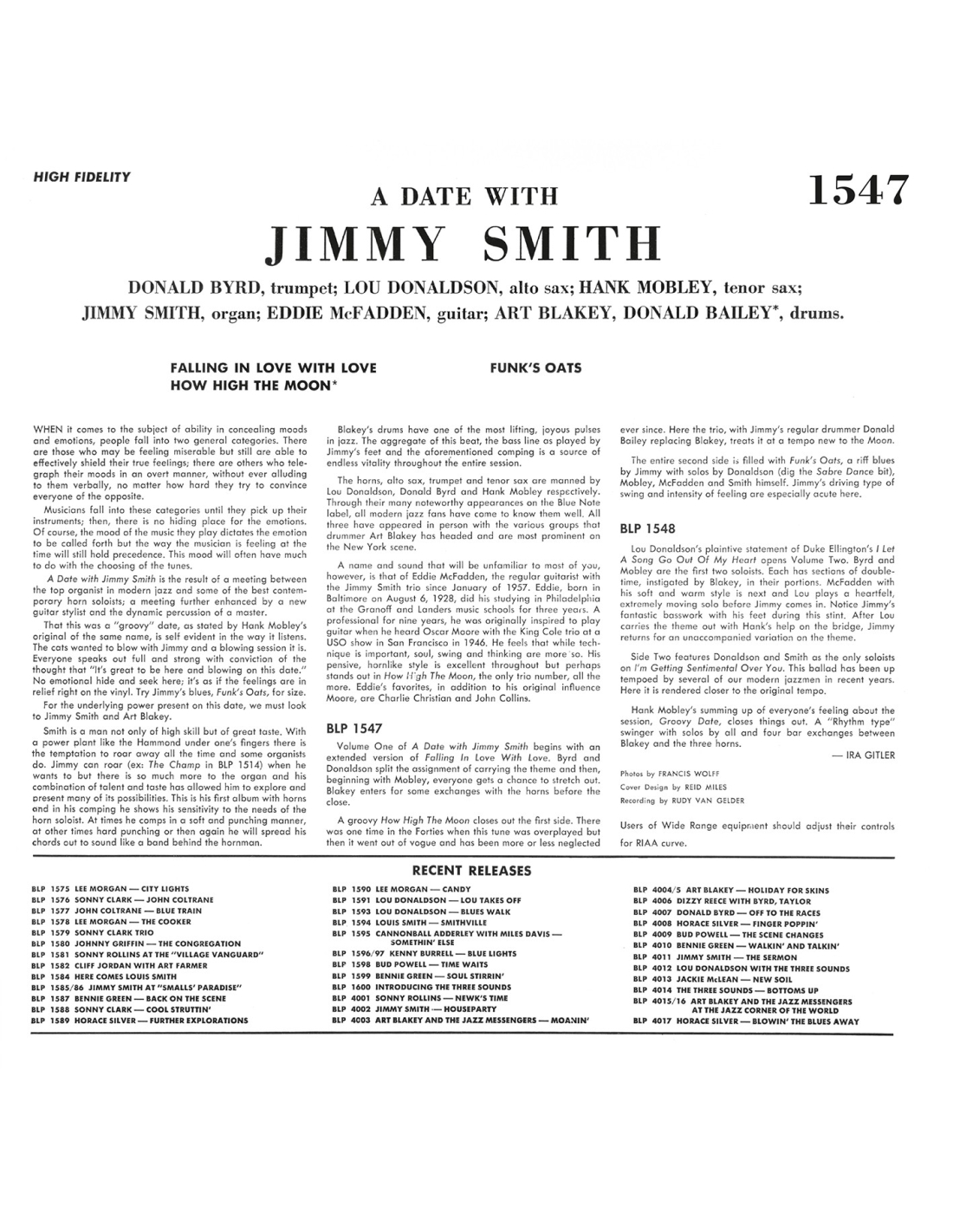 Enregistré au Manhattan Towers de New York City les 11 & 12 février 1957, cet album rassemble la crème des Jazzmen du moment. Jimmy Smith aux claviers est entouré de Donald Byrd à la trompette, Lou Donaldson au saxophone alto, Hank Mobley au saxophone ténor, Eddie McFadden à la guitare et Art Blakey & Donald Bailey à la batterie. Bref, un pur...