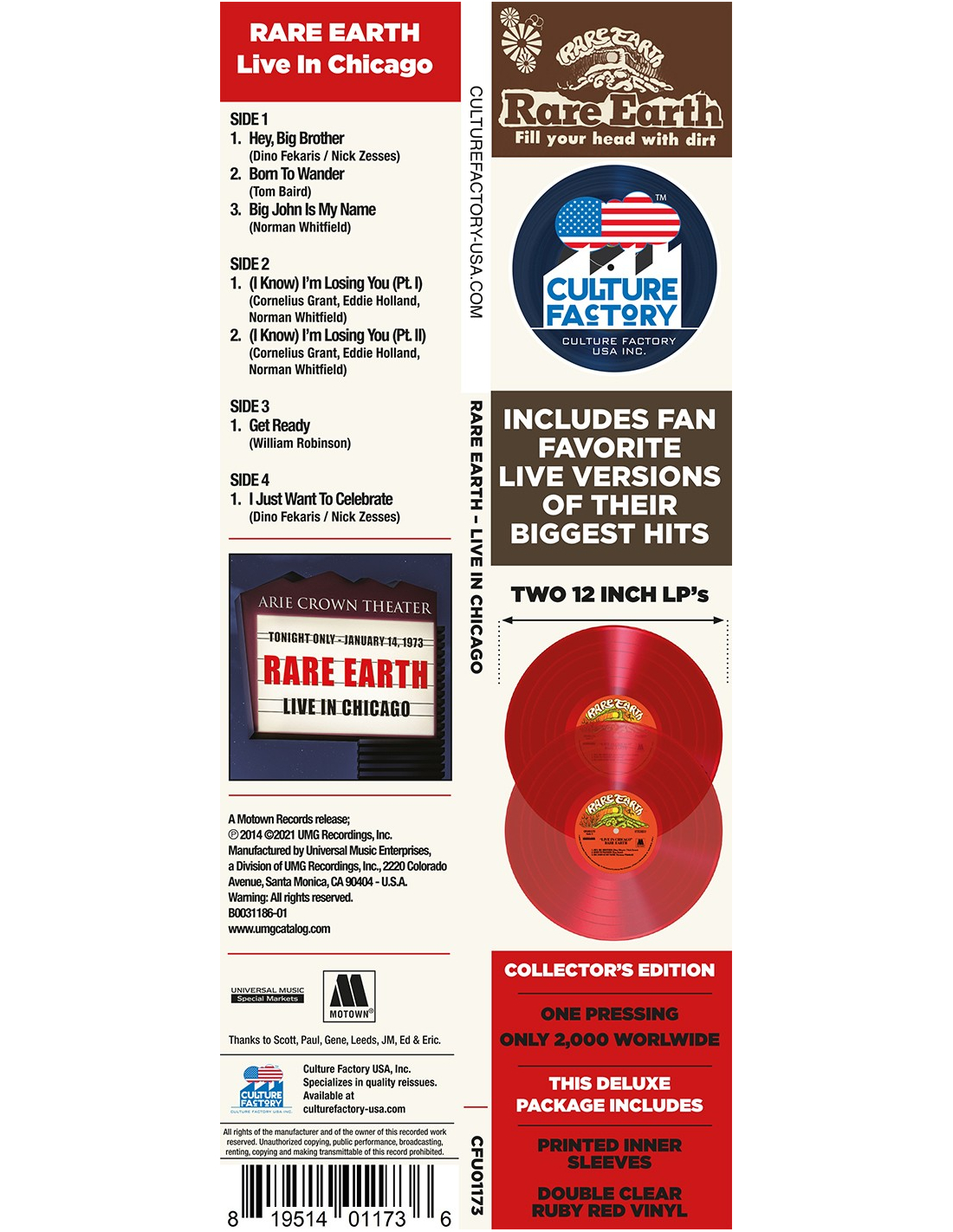 Attention... disque rare ! Après avoir circulé sous le manteau auprès des fans, voici pour la PREMIÈRE FOIS et de manière officielle, l’album Live, enregistré à l’Arie Crown Theater de Chicago en 1974. Au top de leur gloire, les Rare Earth “balancent” devant une foule en délire des versions longues des titres “(I Know) I’m Losing You” et bien évidemment le fameux “Get Ready” !