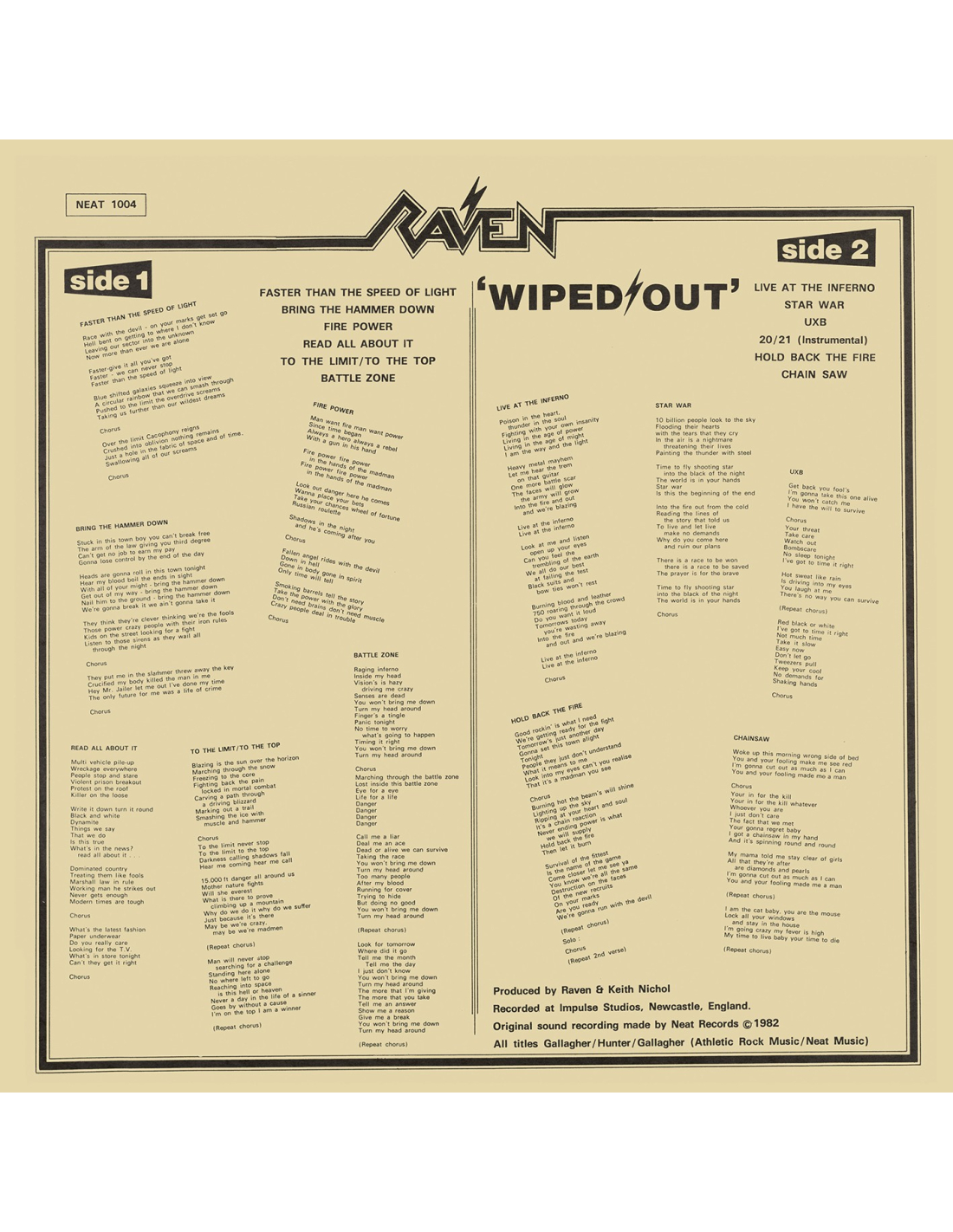 Deuxième album du trio infernal de Newcastle, Wiped Out (Anéanti en anglais) nous délivre quelques morceaux de bravoure comme "Faster than the Speed of Light", "Hold Back the Fire", "Bring the Hammer Down" & "Battle Zone". Ne pas connaître Raven et cet album est crime de métal.
