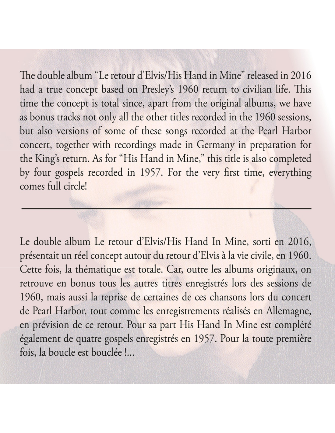Le double album Le retour d’Elvis/His Hand In Mine, sorti en 2016, présentait un réel concept autour du retour d’Elvis à la vie civile, en 1960. Cette fois, la thématique est totale. Car, outre les albums originaux, on retrouve en bonus tous les autres titres enregistrés lors des sessions de 1960, mais aussi la reprise de certaines de ces chansons lors du concert de Pearl Harbor, tout comme les enregistrements réalisés en Allemagne, en prévision de ce retour. Pour sa part His Hand In Mine est complété également de quatre gospels enregistrés en 1957.