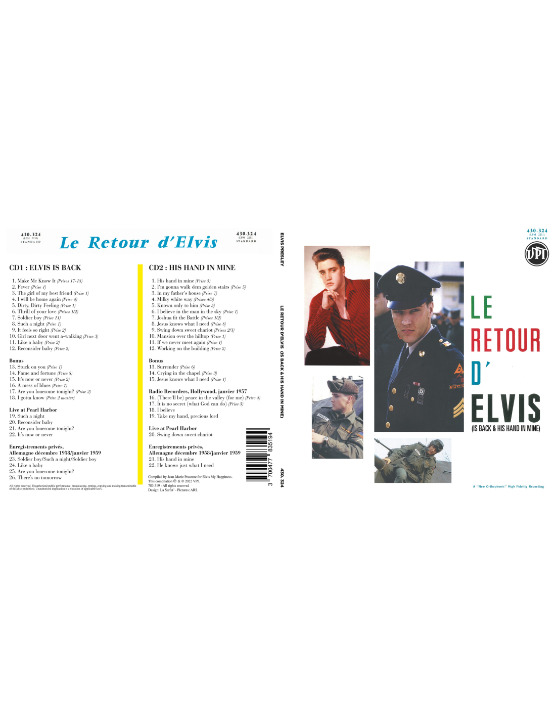 The double album “Le retour d’Elvis/His Hand in Mine” released in 2016 had a true concept based on Presley’s 1960 return to civilian life. This time the concept is total since, apart from the original albums, we have as bonus tracks not only all the other titles recorded in the 1960 sessions, but also versions of some of these songs recorded at the Pearl Harbor concert, together with recordings made in Germany in preparation for the King’s return. As for “His Hand in Mine,” this title is also completed by four gospels recorded in 1957.