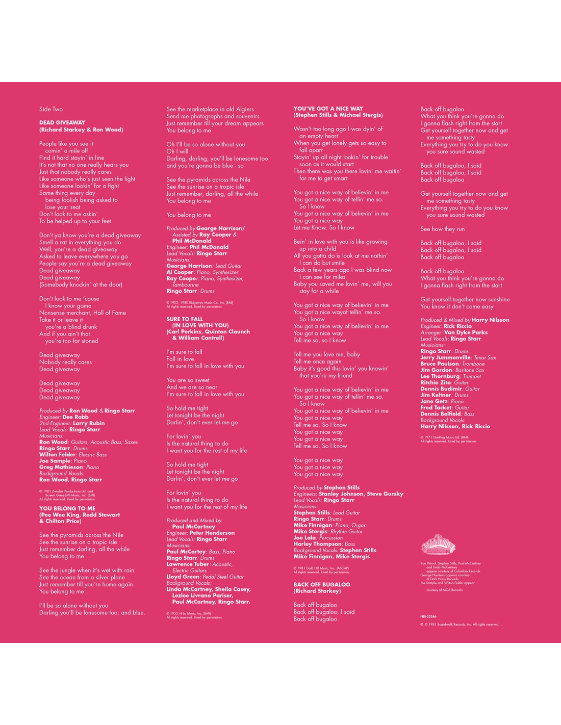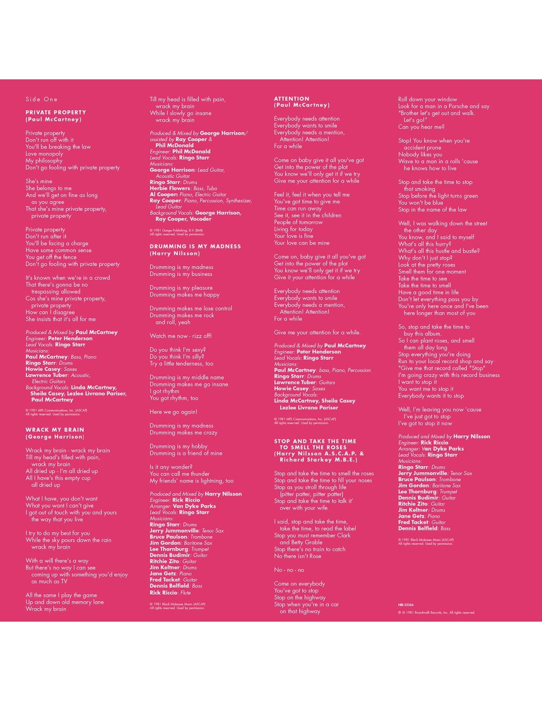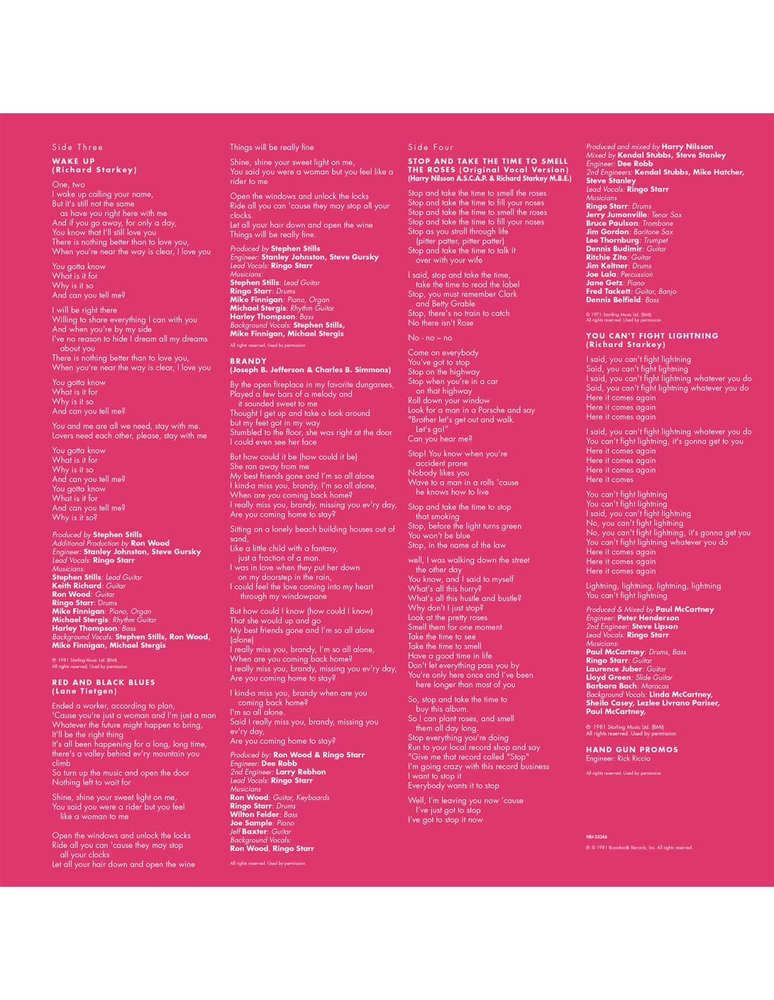 Stop and Smell the Roses est le huitième album solo de Ringo Starr. Sorti en octobre 1981, l'album comprend le single Wrack My Brain, écrit et produit par George Harrison. Il comprend également des contributions de Paul McCartney, Harry Nilsson, Ronnie Wood et Stephen Stills entre autres. Il est ici réédité en Double Vinyle ROUGE & BLANC avec pour la première fois des bonus sur ce support.