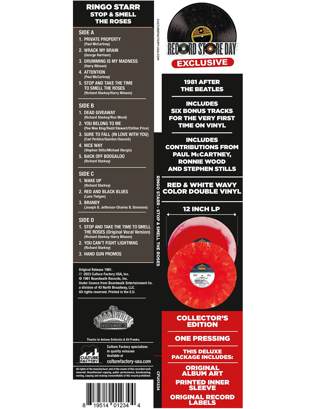 Ringo Starr achieved international fame as the drummer for THE BEATLES. Stop and Smell the Roses is a studio album originally released in 1981 which includes contributions from Paul McCartney, Ronnie Wood and Stephen Stills. The six bonus tracks have never before been released on vinyl. This double LP set, has deluxe packaging that will include an OBI side strip, gatefold album jacket with two pockets, printed inner sleeves, original record labels and specialty color vinyl. This is a MUST for all fans/collectors of THE BEATLES.