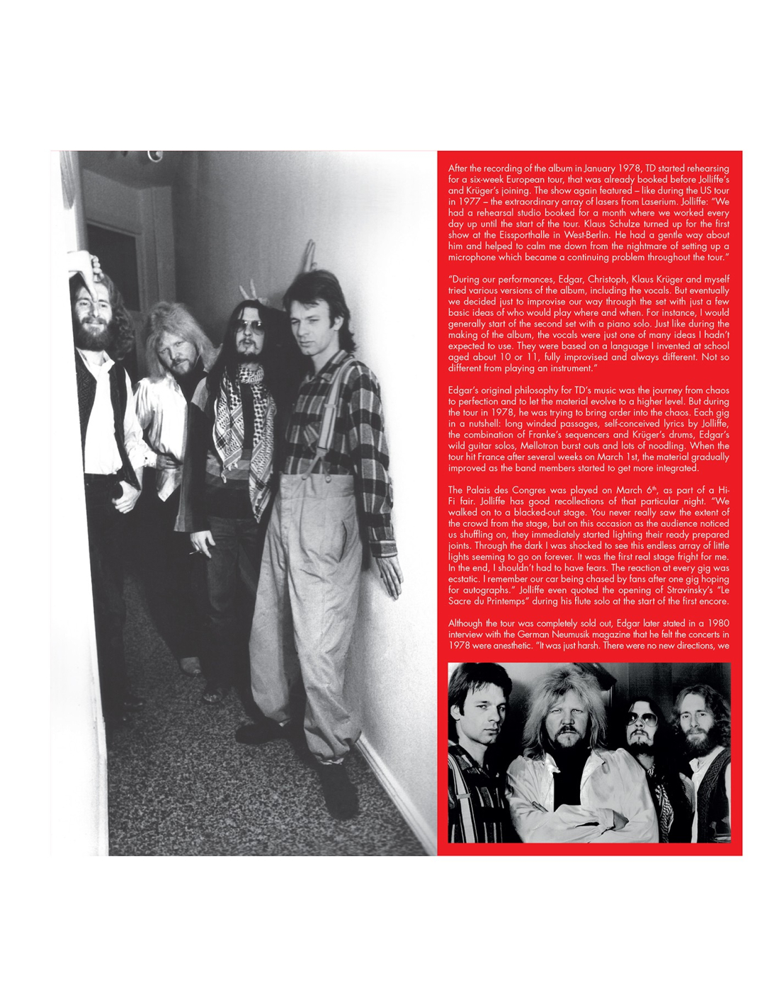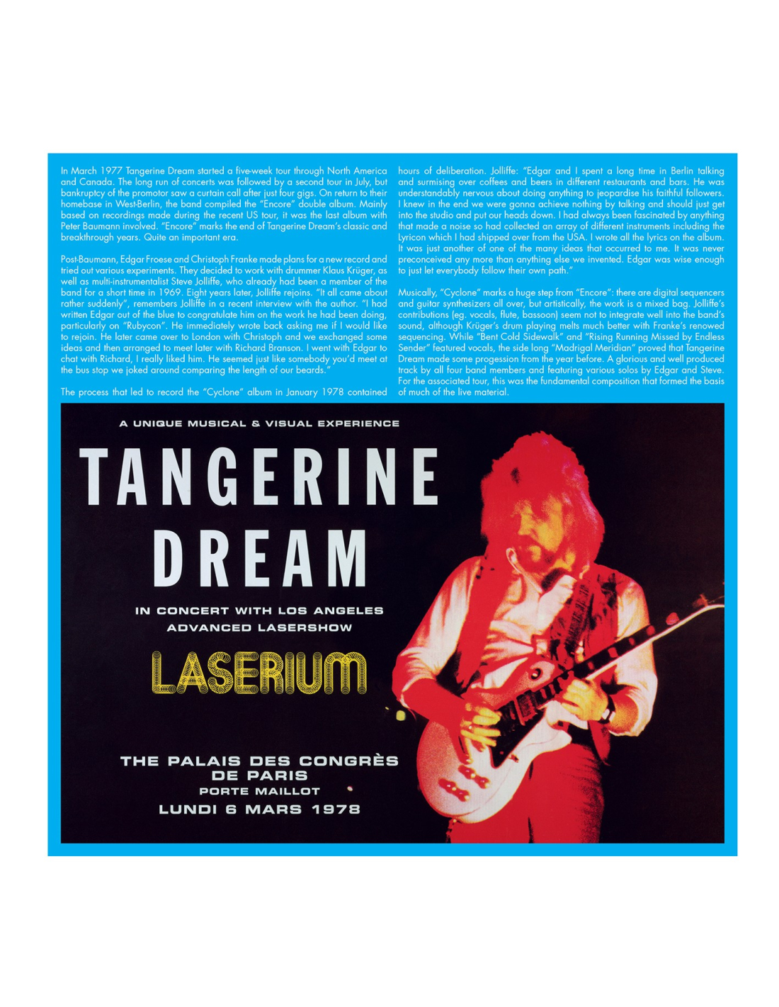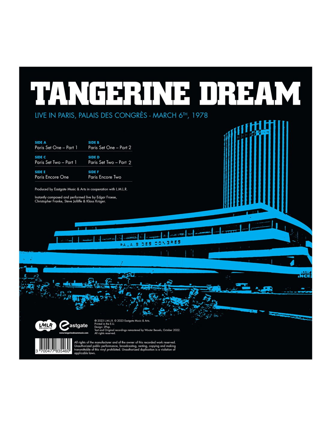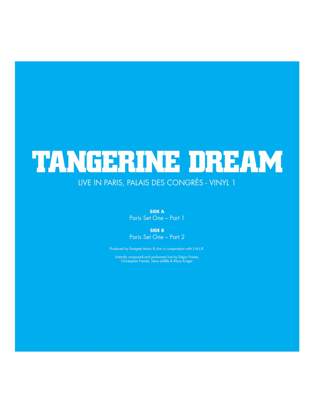 Recorded live on March 6th, 1978 at the Palais des Congrès in Paris… This famous concert… Never released on vinyl (nor in its normal speed) presents the line-up composed of Edgar Froese, Christopher Franke, Steve Jolliffe & Klaus Krüger.