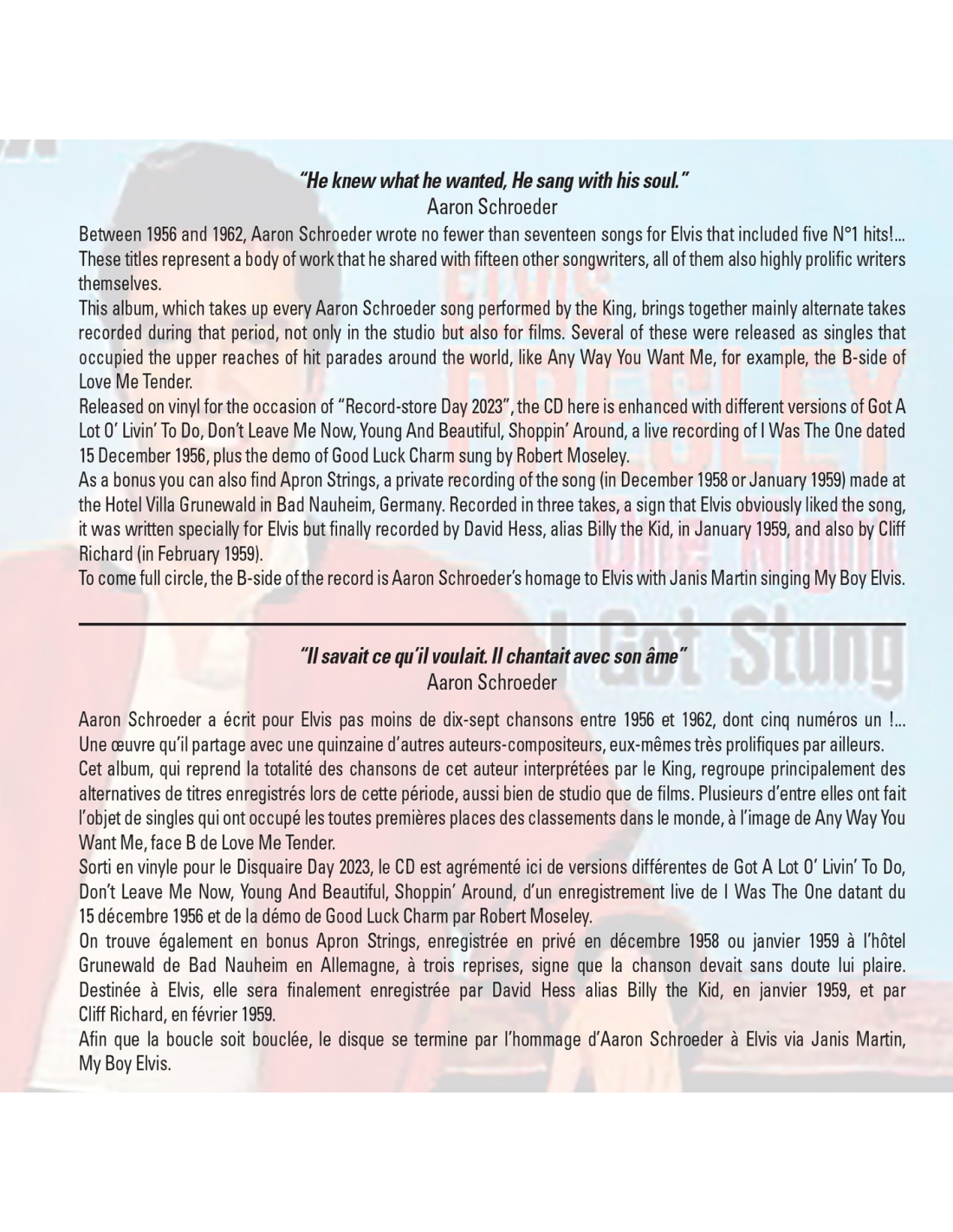 Aaron Schroeder a écrit pour Elvis pas moins de dix-sept chansons entre 1956 et 1962, dont cinq numéros uns !... Une œuvre qu’il partage avec une quinzaine d’autres auteurs-compositeurs, eux-mêmes très prolifiques par ailleurs.