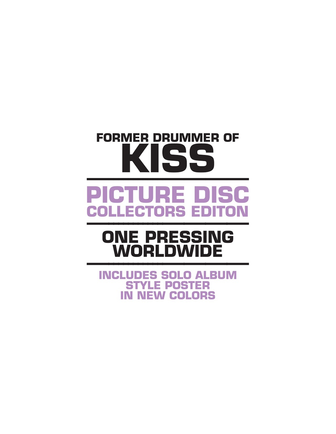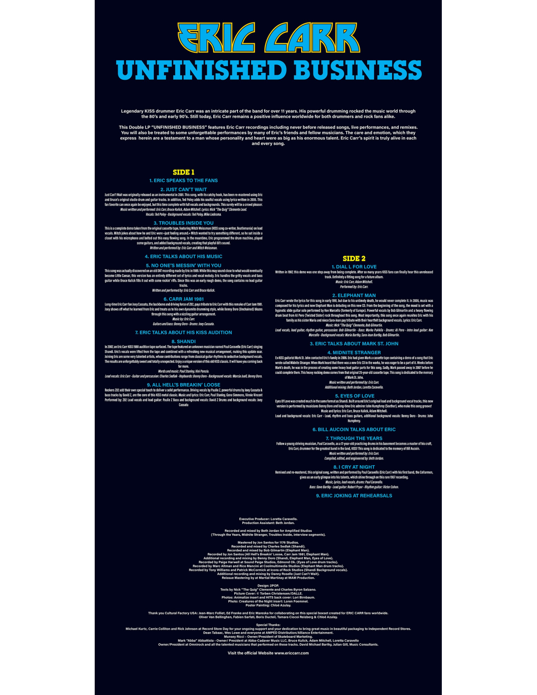 Here's the one Kiss fans must have... drummer Eric Carr's posthumous album (Unfinished Business)... Reissued for the first time as a Picture Disc and with a previously unreleased Poster.