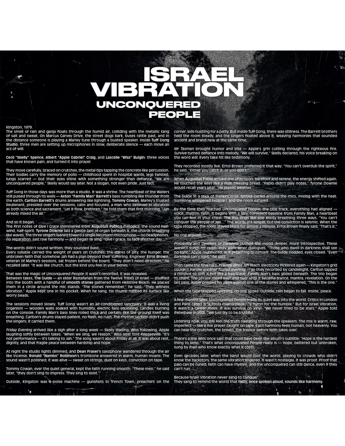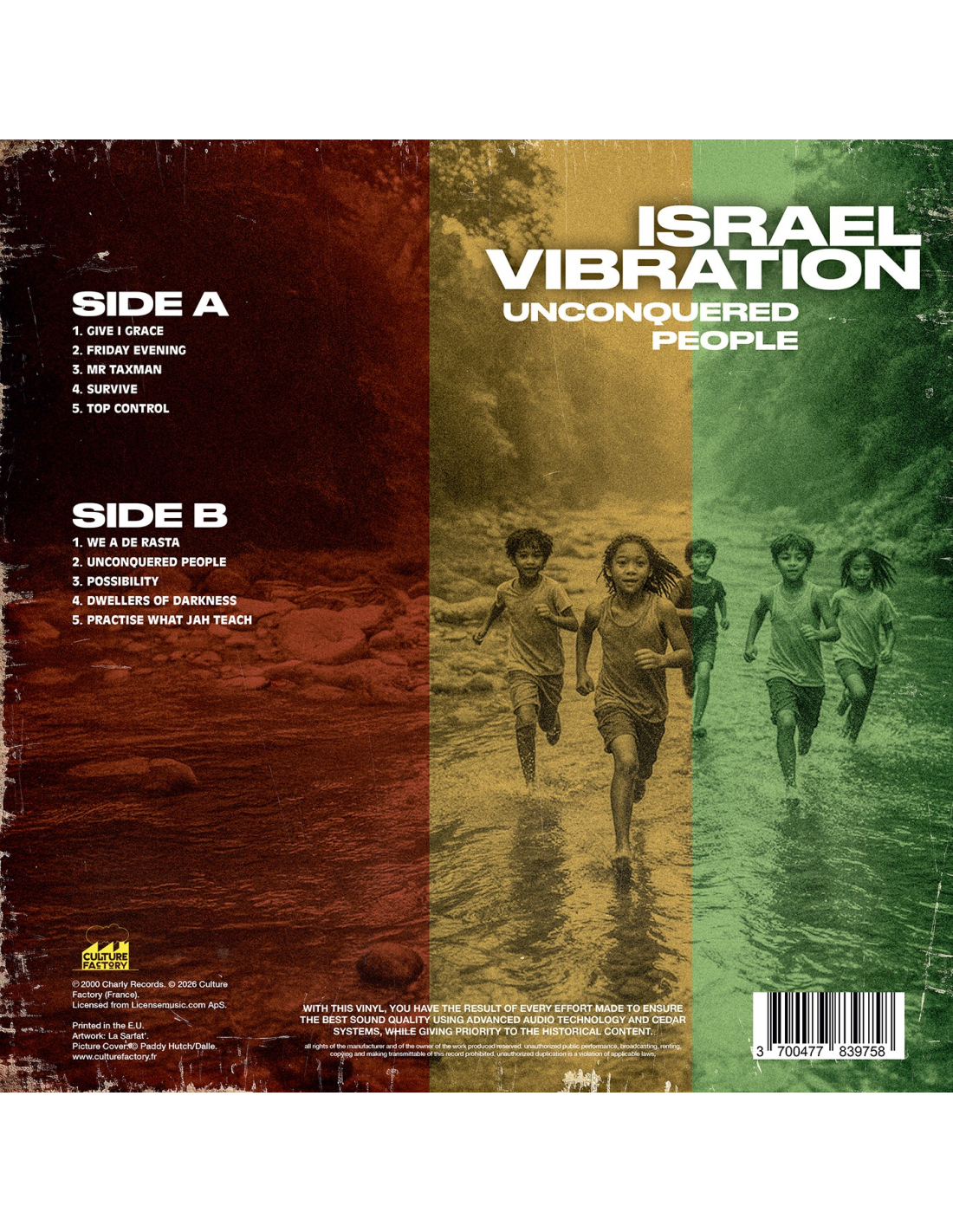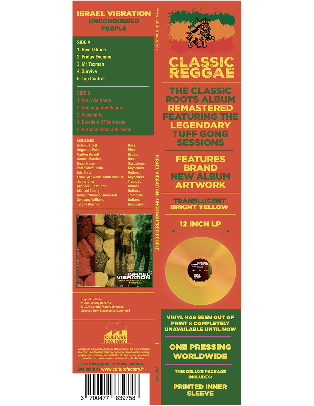 Unconquered People d’Israel Vibration frappe par la force de ses titres, véritables manifestes. Give I Grace, Survive ou Top Control posent d’emblée un cadre spirituel et politique sans détour. Sur la face B, We A De Rasta et le morceau-titre Unconquered People affirment une identité debout et indomptable. Dwellers of Darkness et Practise What Jah Teach referment l’ensemble avec exigence. Un classique du roots reggae, profond et habité, présenté en édition limitée vinyle JAUNE.
